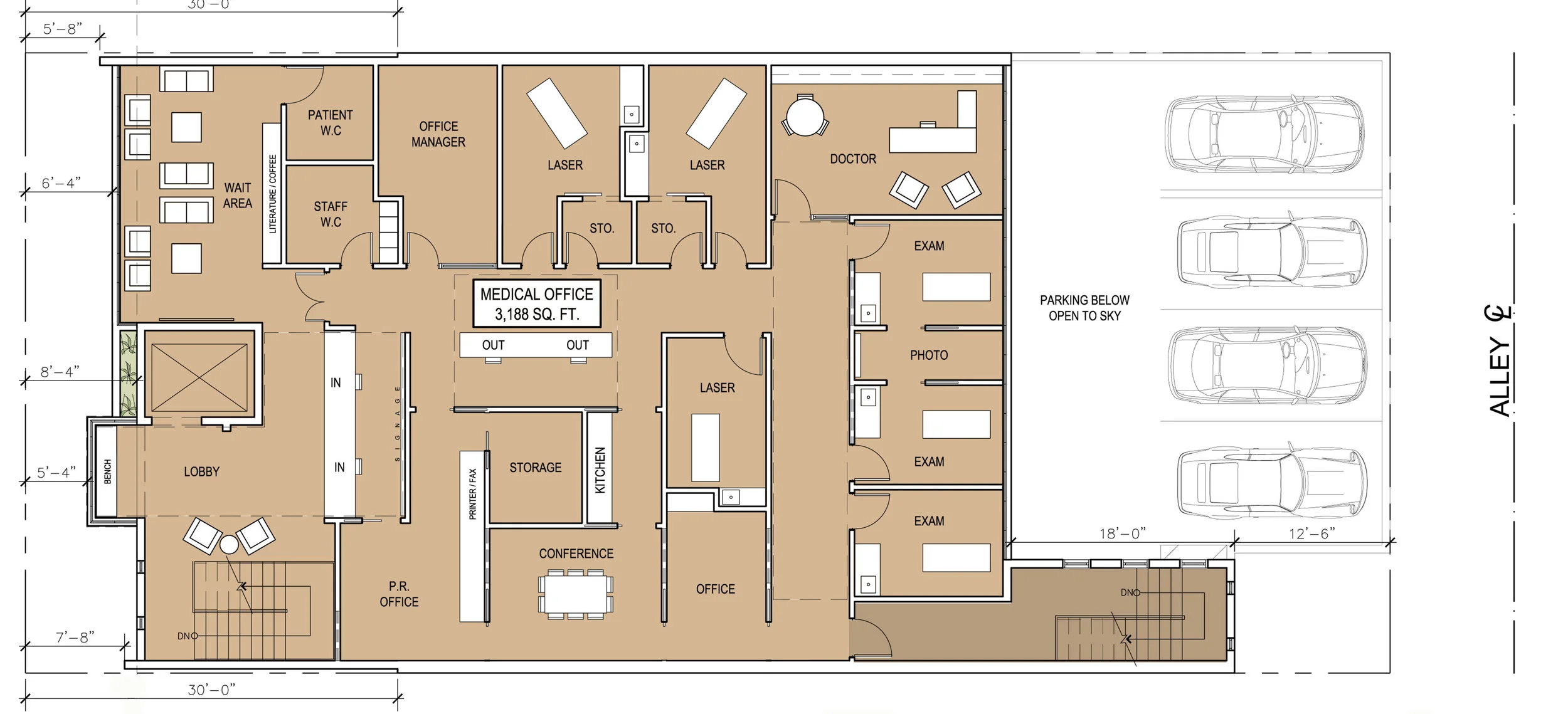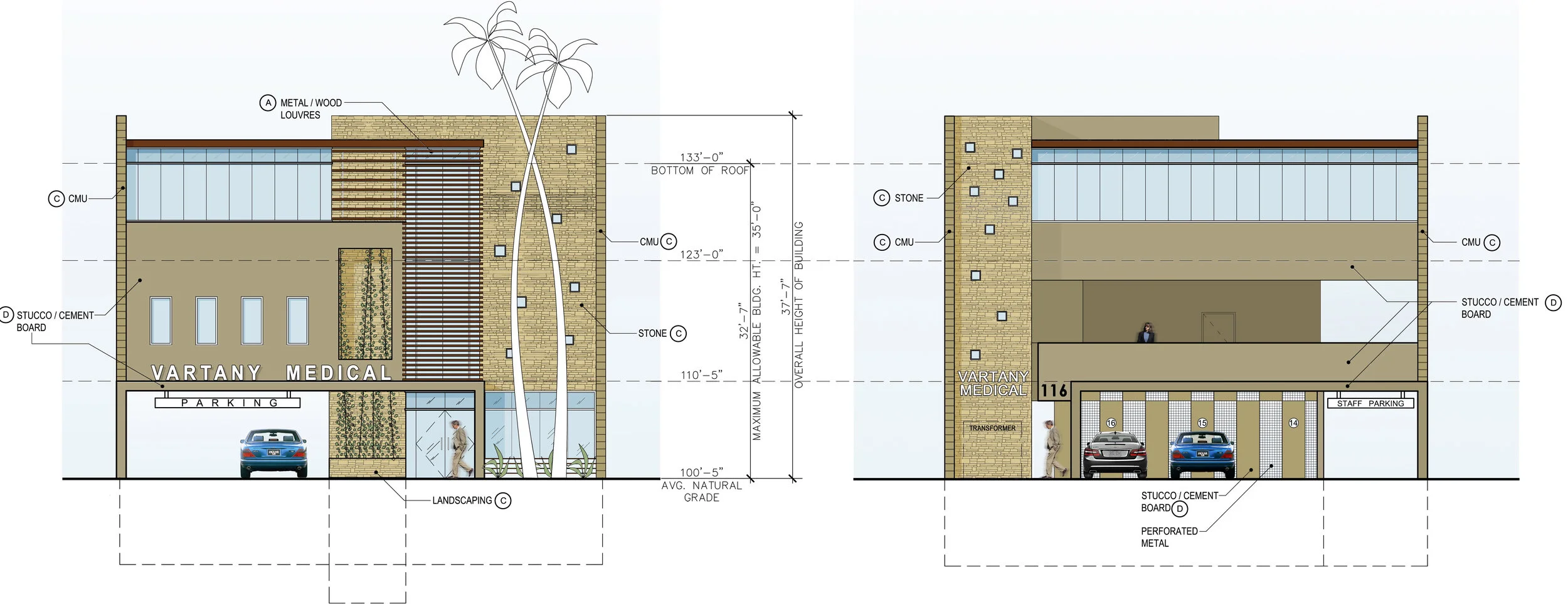 This new construction ground-up 3-story medical office building held the challenge of fitting two stories with a medical office and outpatient surgical center on a small lot complete with a parking garage. A complicated parking system was employed to meter the vehicles in and out of the one-ramp underground lot. The contemporary aesthetic of the building fits with the look of the surrounding hospital and medical buildings in Burbank.